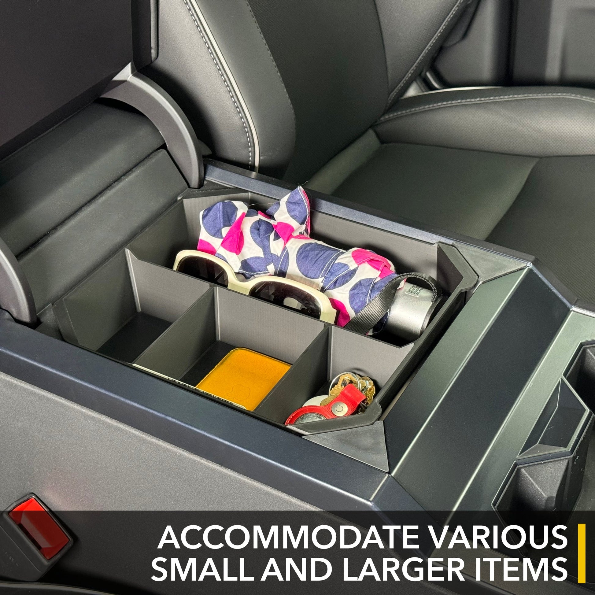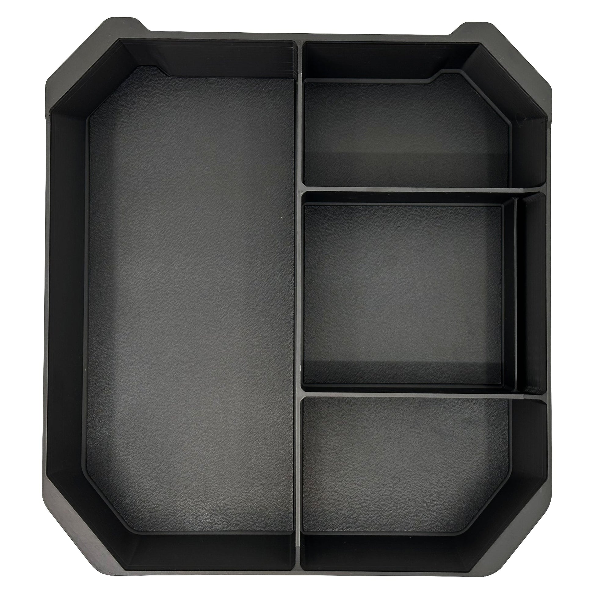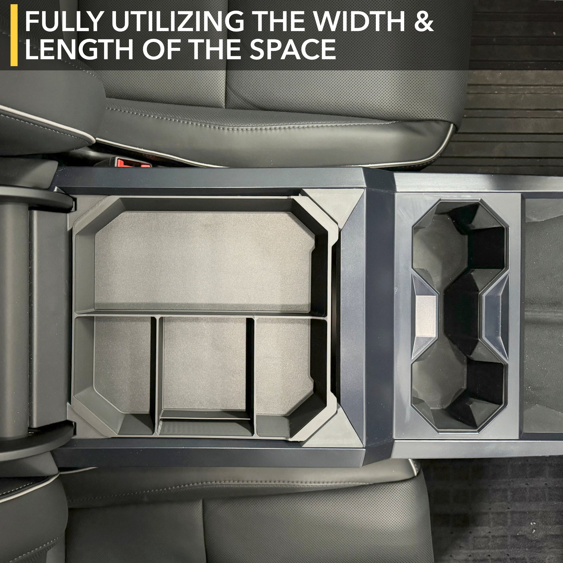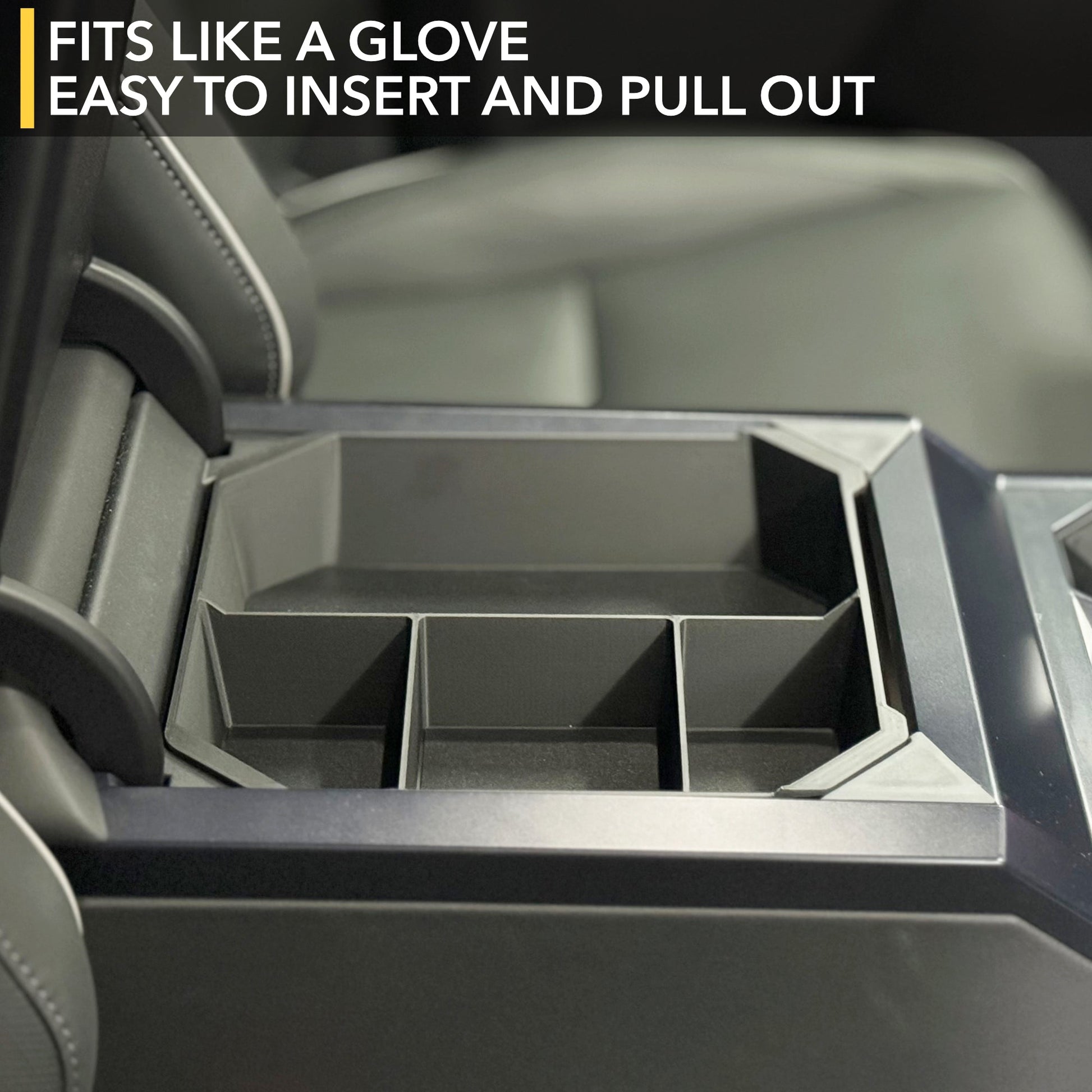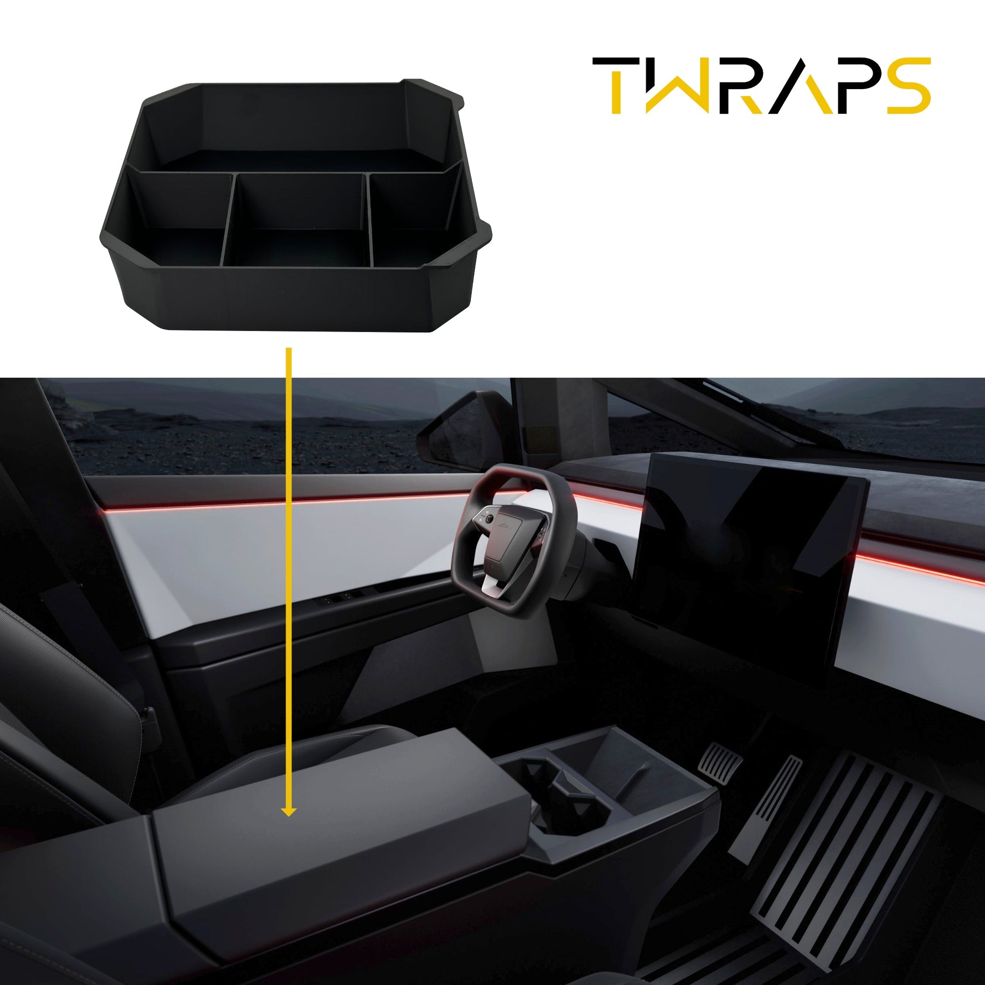 Introducing the TWRAPS Armrest Organizer for the Cybertruck center console. Crafted with durable ABS and premium leather liners, each compartment is meticulously designed to keep your essentials organized and minimize rattling. Proudly made in the USA, our industrial-inspired organizer is a testament to quality craftsmanship and functional design.