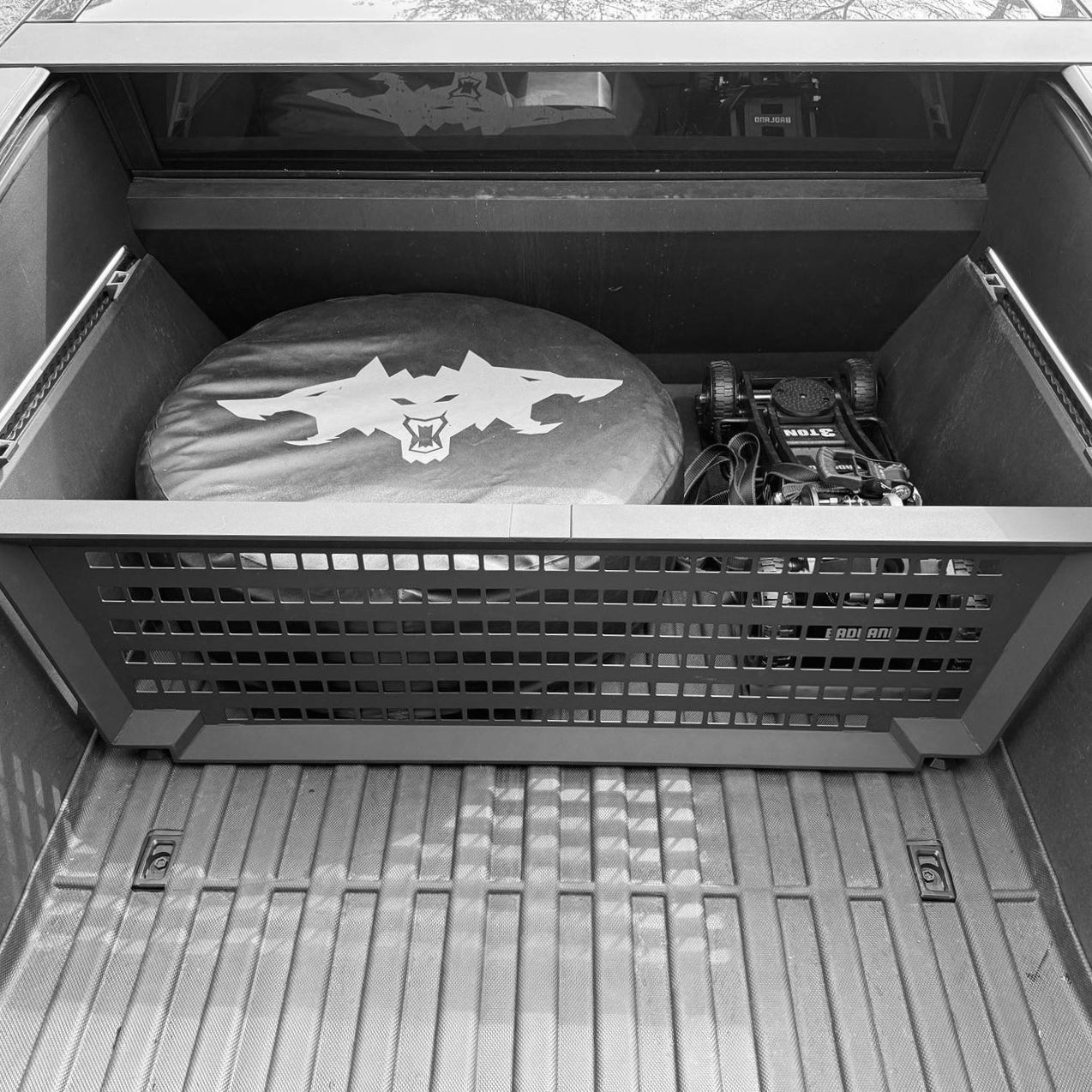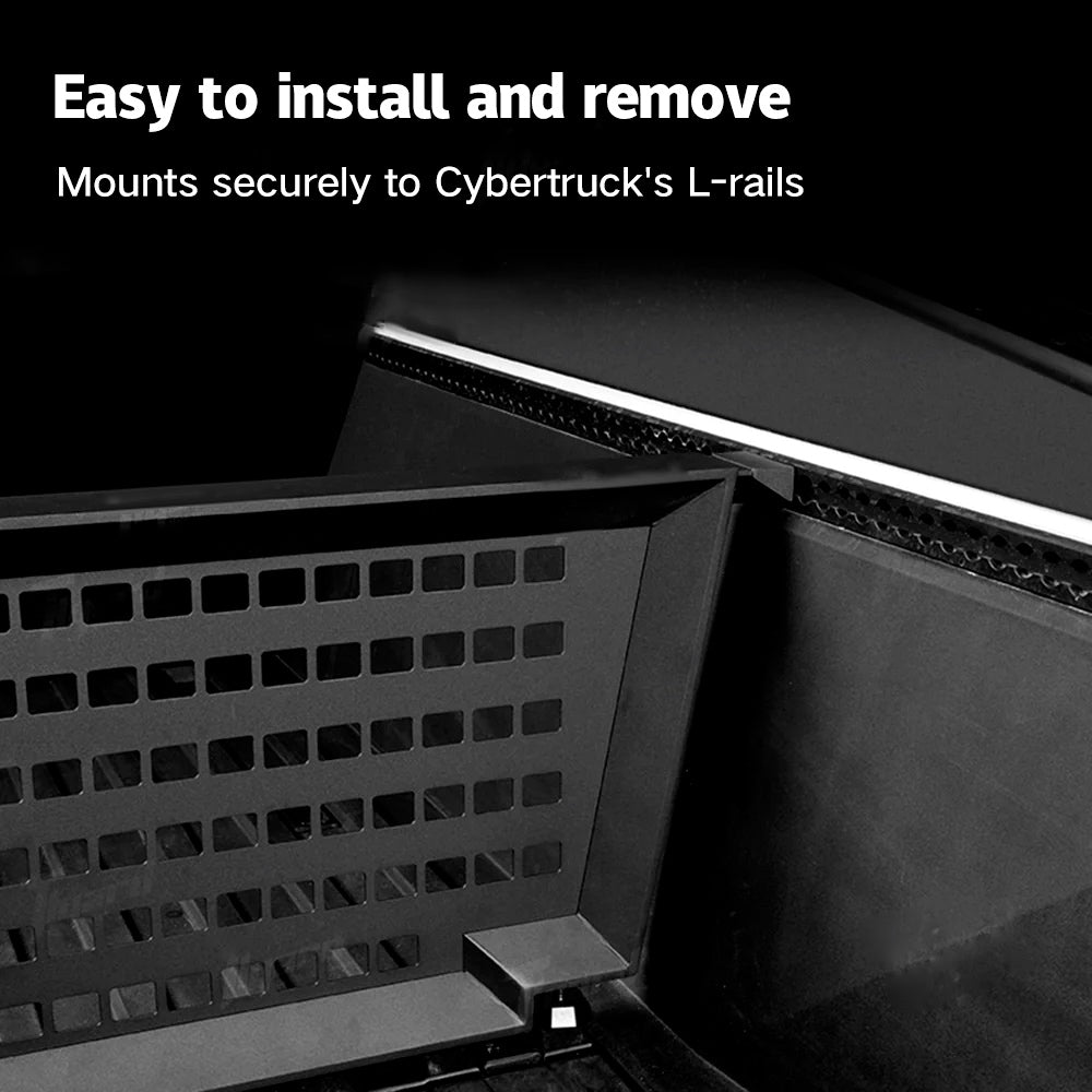 Constructed of a lightweight & rigid aluminum alloy, this bed divider secures into the L-Tracks along the bed of the Cybertruck, allowing you to keep gear separated and secure in the vault without anything sliding around. This also features a Molle pedal system for attaching additional storage bags and accessories, enhancing versatility.