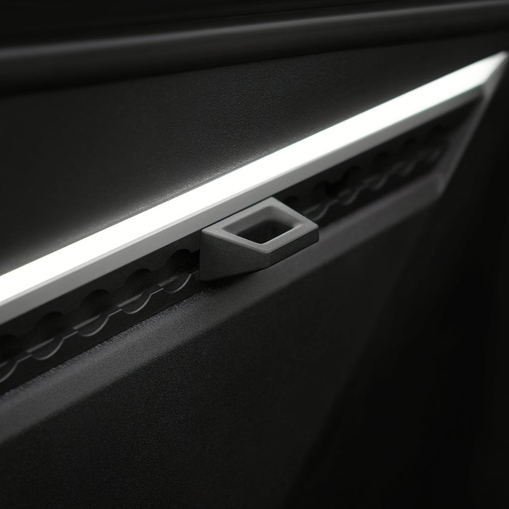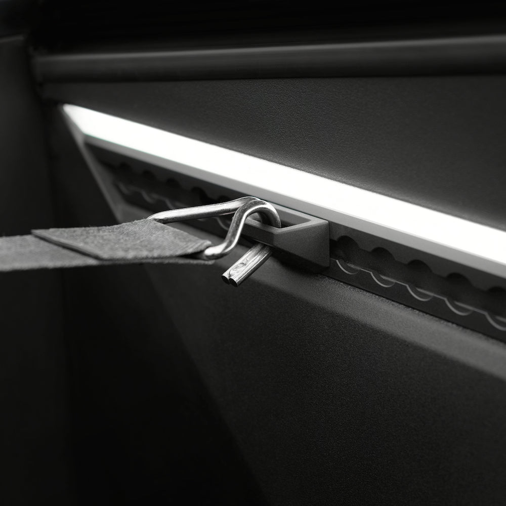 These hooks are just like OEM and can be mounted anywhere along the L-Track of your Cybertruck's bed, providing flexible tie-down points to anchor rope, hooks, carabiners and more. This set includes 4 L-Track Hooks and a Torx screwdriver for installation.