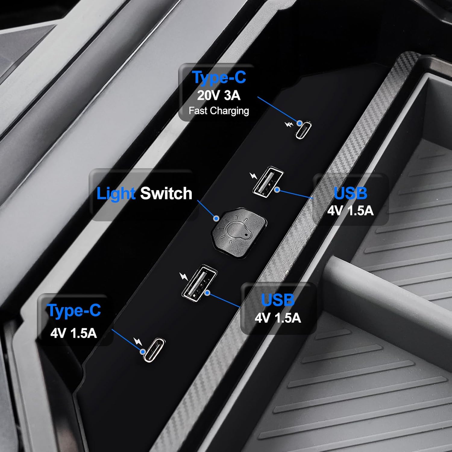 • FIT AND FUNCTION: Specifically designed for your Cybertruck, the center console tray comes with four ports (2 USB and 2 type-C interfaces). One Type-C port supports up to 60W high-speed charging, providing sufficient power for laptops, tablets, smartphones, and other high-demand electronics. Ideal for Cybertruck owners who need multiple charging options on the go.