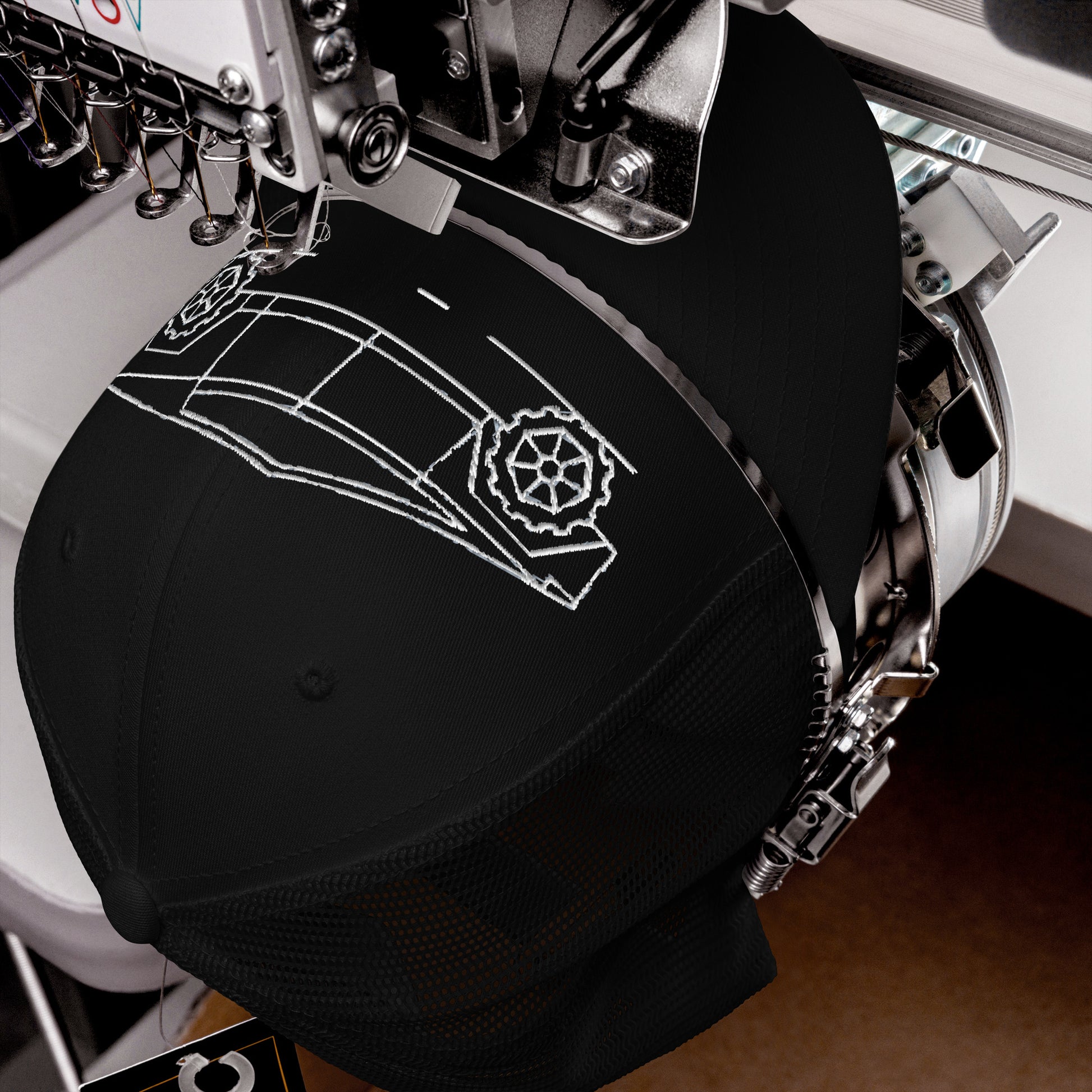 This six-panel cap with a mesh back features an iconic, vector image of the Cybertruck embroidered prominently on the front.